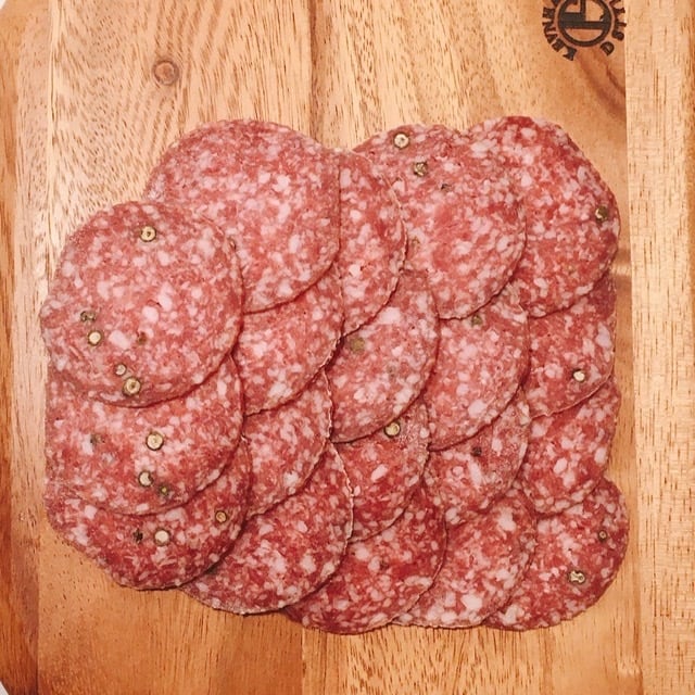 約1ヶ月かけて作るハードタイプのサラミ。心地よい酸味と凝縮した味わいは格別のおつまみです